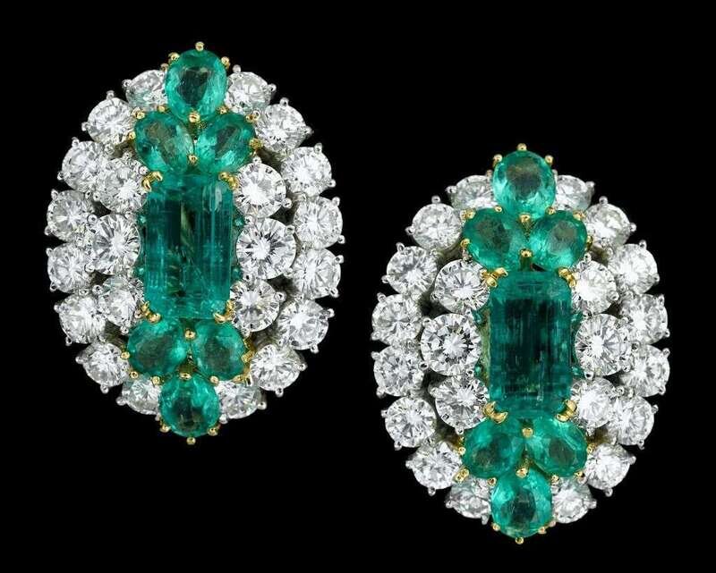 Elongated emerald cut emerald followed by three oval cut emeralds on either end, surrounded by twenty-two petite round cut diamonds. Total diamond weight approximately 3.3 carats per earring, post and omega French backing.