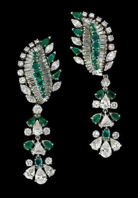 Emerald and diamond cluster earrings, each earring displaying seven round emerald-cuts of graduated size framed by thirty-four tapering baguette cut diamonds, surrounded by a marquise and round cut diamond frame, total diamond and emerald count, forty-nine. Earrings accompanied by articulated drops consisting of a single round cut diamond followed by two pear shaped emeralds,a pear shape diamond framed by round cut diamonds on either side, two pear shaped emeralds on either side of a single triangular cut diamond, single round emerald-cut flanked by a round cut diamond on either side finishing with three graduated pear shaped diamonds.