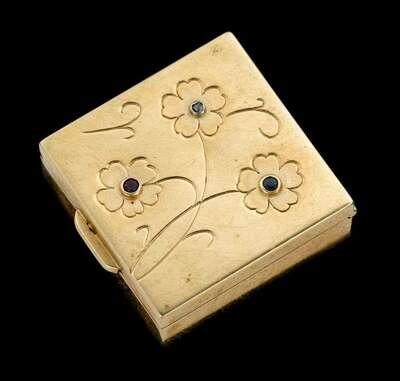 Floral etched square pill box with petite ruby, sapphire, diamond accent, signed by the maker, serial no. 4235.