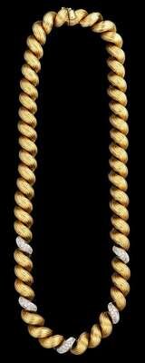 Textured modified rope twist links of yellow gold with five white gold each diamond set with pave diamonds, signed by GGR.