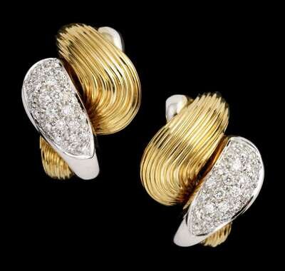 Textured modified rope twist clip earrings, pave diamond set.