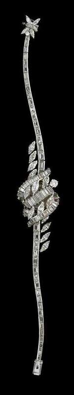 Platinum circular cased silver tone face with dot and arrow dial signed by the maker, face displays a diamond set cover in ribbon motif, tapered diamond baguette wristband with diamond butterfly style clasp. Approximately 4.25 carats total diamond weight.