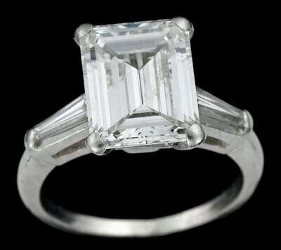 Classic emerald-cut diamond, approximately 3 carats, framed by a tapered baguette-cut diamond on either side.