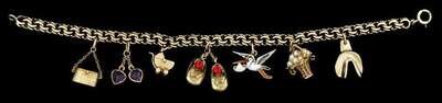 Maternity themed charm bracelet with enamel and gem set charms of varying size and form.