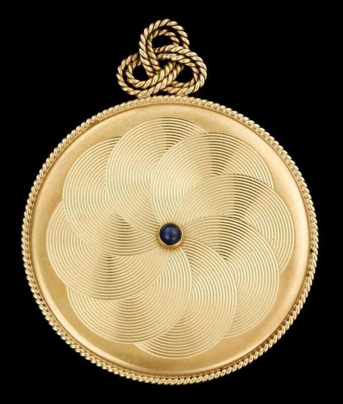 Etched with fan design, rope twist frame, signed by the maker, serial no. illegible. Accompanied by original Cartier case.