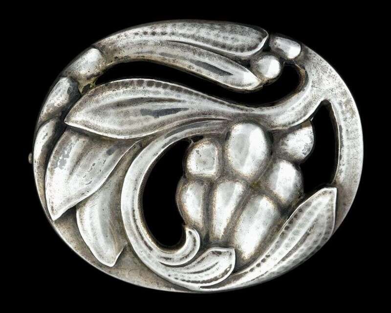 Unusual over-sized puffed oval brooch berry and leaf motif, signed Georg Jensen, Denmark, serial no. 65, 830S.