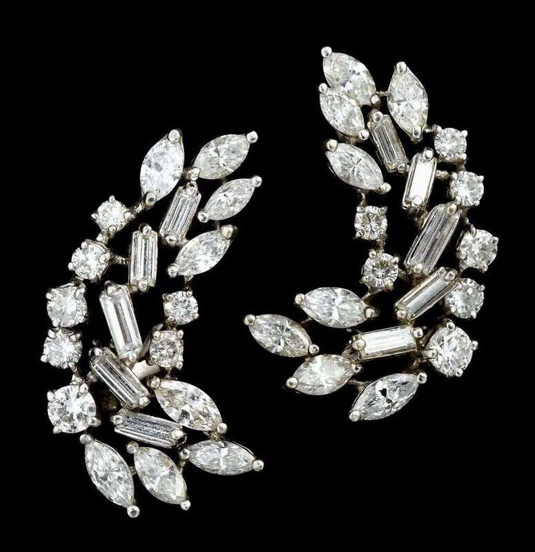 Consisting of a collection of baguette cut diamonds, round and marquise cut in abstract form.
