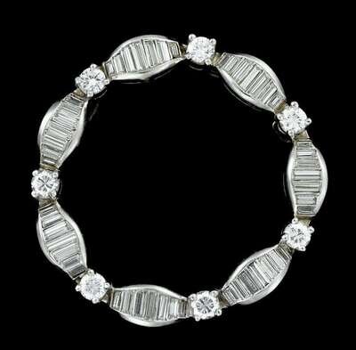 Alternating baguette cut ribbon form setting with petite round cut diamond spacers.