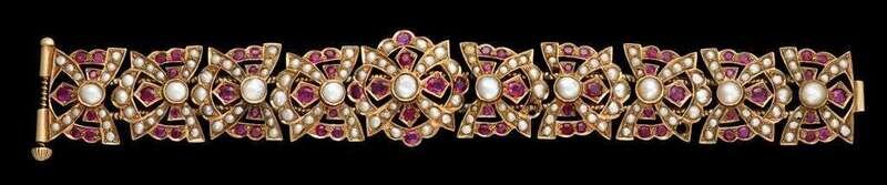 Seed pearl and ruby set rose gold links independently strung on articulated snake chain, screw down clasp.