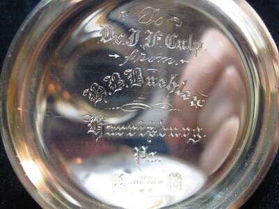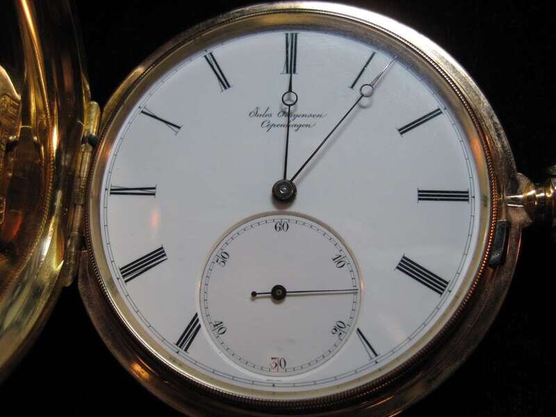 Circular cased white enamel face with Roman numeral dial, signed by maker, Copenhagen, displaying subsidiary seconds dial, reverse inner case signed JJ, serial no.12806, 'patent 1867 january 15', mechanical movement. Inside case cover engraved 'To Dr. Culp from H.B.Buehler, Harrisburg, PA'. Accompanied by original case.