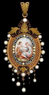 Oval painted porcelain plaque of lady painting with the aid of putto, surrounded by a yellow gold frame with alternating seed pearls and petite rose cut diamonds; foliate bail. Reverse displays blond hair lock under glass. Accompanied by original case.
