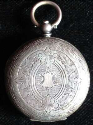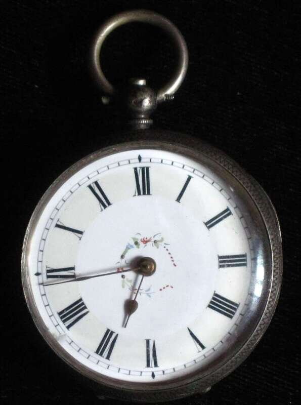 Key wind, black on white Roman numeral dial, engraved back, Diam. 1 1/2 in.