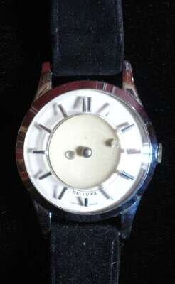 Circular base metal case, "bar"numerals, diamond hands, suede bracelet.