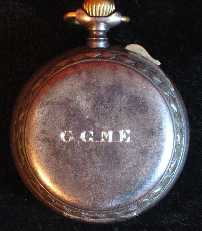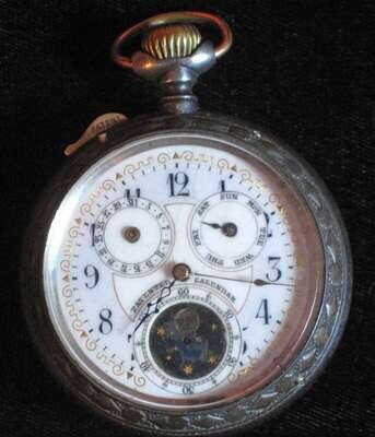 Two small black on white dials, days and weeks, moon and stars dial, movement No. 59666.