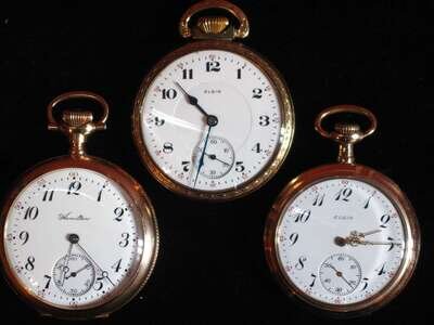Elgin, black on white Arabic numeral dial with subsidiary seconds dial, No. 28150245, Elgin, black on white Arabic numeral dial, No. 2189106, and Hamilton, black on white Arabic numeral dial with subsidiary seconds dial, No. 742855.