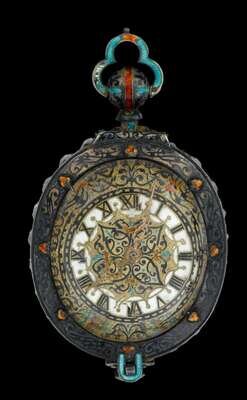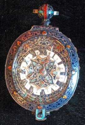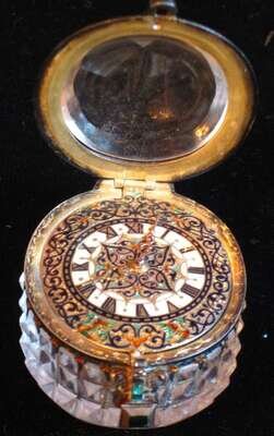 Key wind, paneled oval crystal lens in silver and jeweled frame, oval watch face with gilt and enamel border, circular enameled face with black Roman numerals on white band dial, set into a cut crystal case.