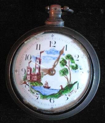 Key wind, enameled face displaying a castle beside the sea with a ship approaching, black on white Arabic numeral dial.