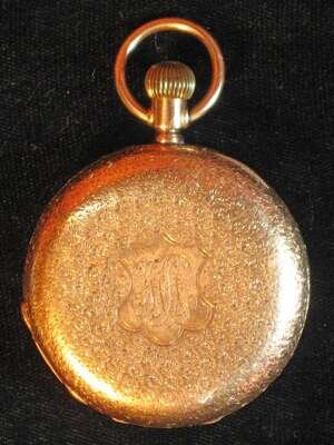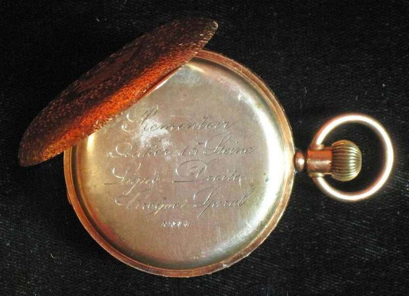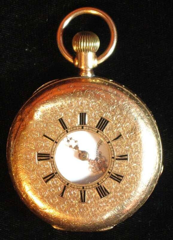 Case with allover chased decoration, small ocular to cover with black Roman numeral dial on the edge of the cover, inner movement cover, No. 883.