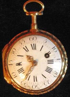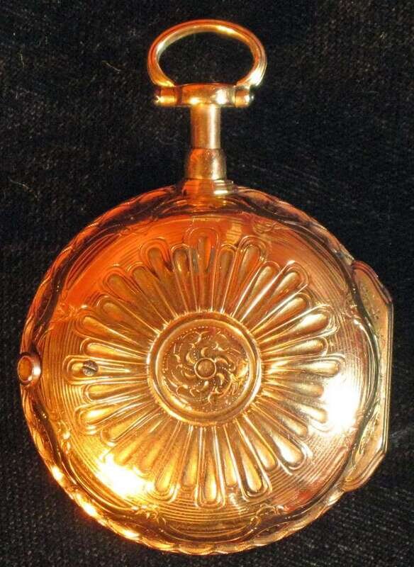 Key wind, black on white Roman numeral dial, ornate gold hands, sunburst chased back cover.