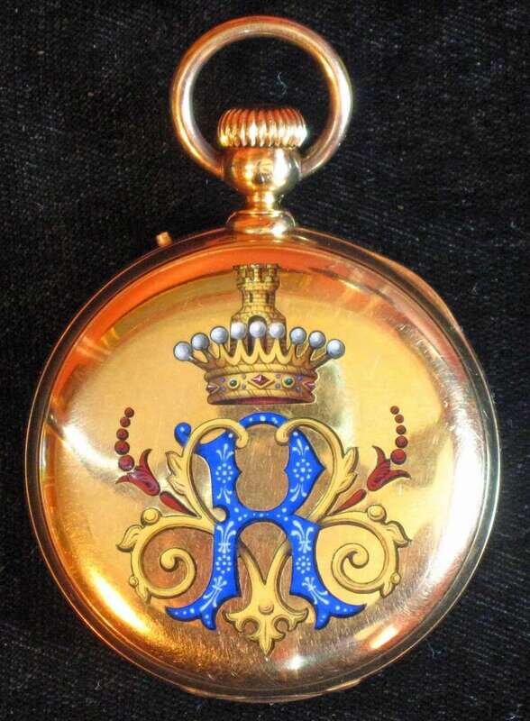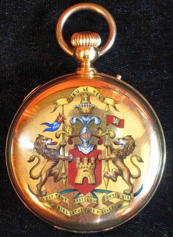Black on white dial with subsidiary seconds dial. Both covers decorated with polychrome crests.