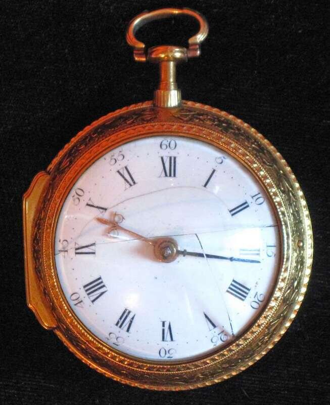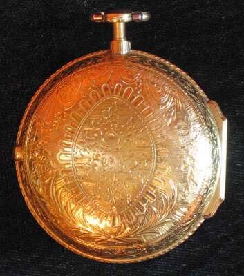 Pear case, black on white Roman numeral dial, arched lens, outer case highly chased, movement No. 9659, case made by "I P" and dated 1783.