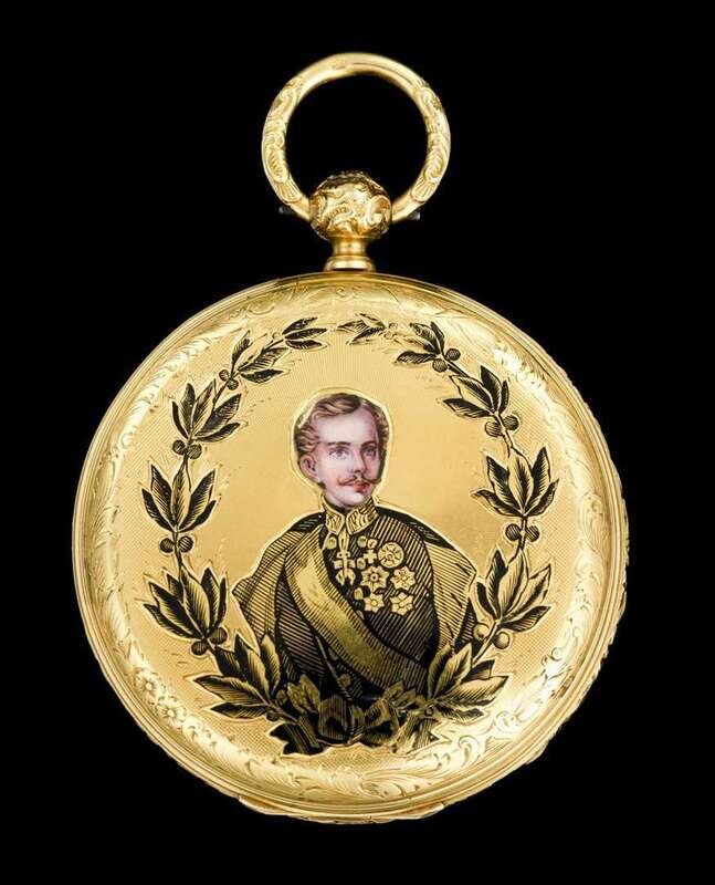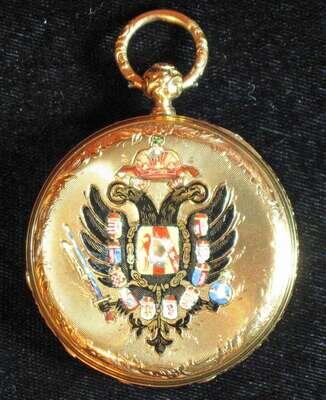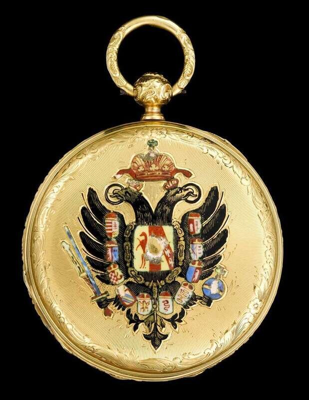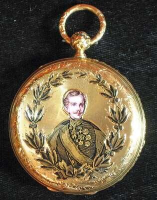 Black on white Roman numeral dial with subsidiary seconds dial, front lid engraved and highlighted with enamel portrait of Emperor Franz-Joseph in a uniform, the reverse with a double eagle highlighted with polychrome enamels.
