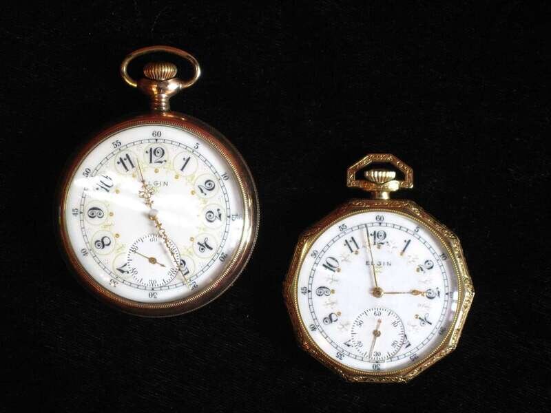 Elgin, ten sided case, black on white Arabic numeral dial with subsidiary seconds dial, decorative face, No. 25081651and Elgin, black on white Arabic numeral dial with subsidiary seconds dial, decorative face and hands, No. 18019841.
