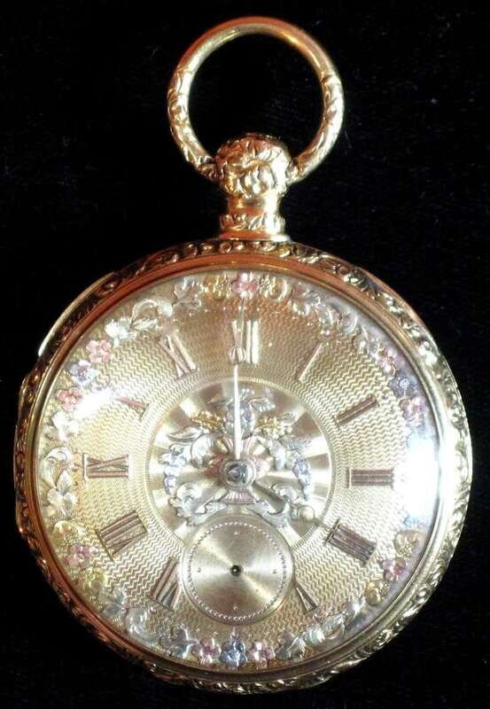 Key wind, movement number 7015, ornately decorated face with floral and scrolls in yellow, white and rose gold, center and border machine finished ground, raised rose gold Roman numeral dial, subsidiary seconds dial.