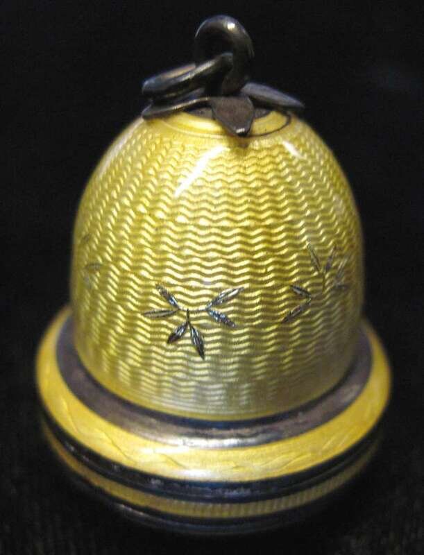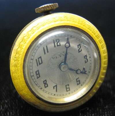 Bell shaped pendant, underside displays round watch face with Arabic numeral and dash dial, signed by Ultus Watch Co., movement made by Ablus Watch Co., yellow guilloche ename case.
