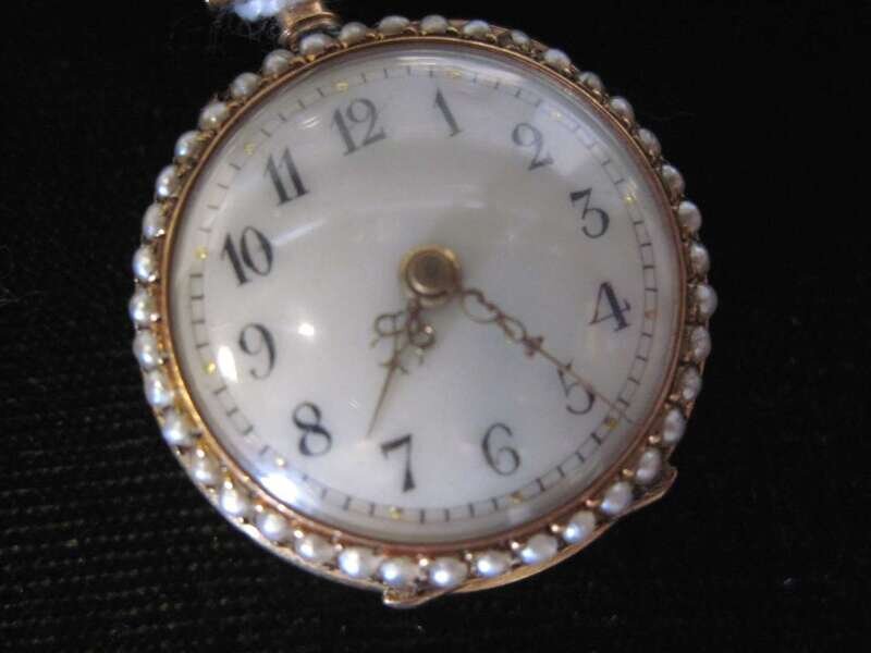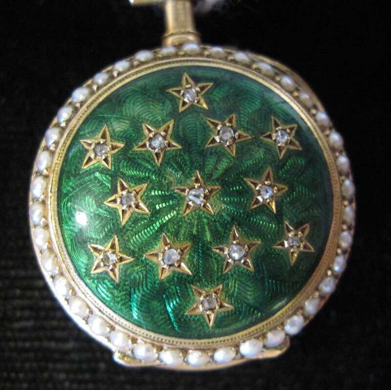 Arabic numeral nameless dial, seed pearl bezel, green guilloche cased accented by petite inset yellow gold stars set with petite diamonds chips.