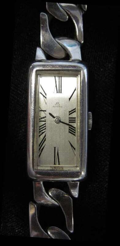Alternating curb link and long link sterling silver bracelet, Roman numeral dial signed by maker.