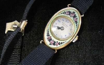 Lady's petite 14 karat yellow gold enameled wristwatch, Weltall Watch Co. 1920s