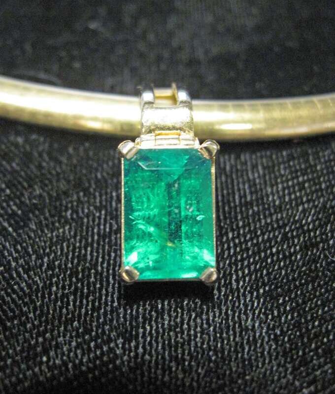 Yellow gold omega style necklace with emerald cut Columbian emerald pendant.