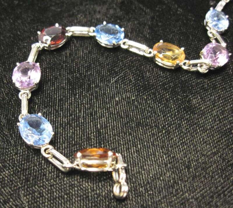 Oval cut amethyst, garnet, citrine and topaz prong set.