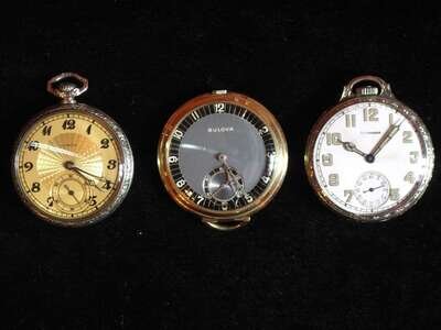 Bulova, white on black ring Arabic numeral dial with subsidiary seconds dial, Illinois, black on gold Arabic numeral dial with subsidiary seconds dial, No. 4279181and Studebaker, gold on white Arabic numeral dial with subsidiary seconds dial.
