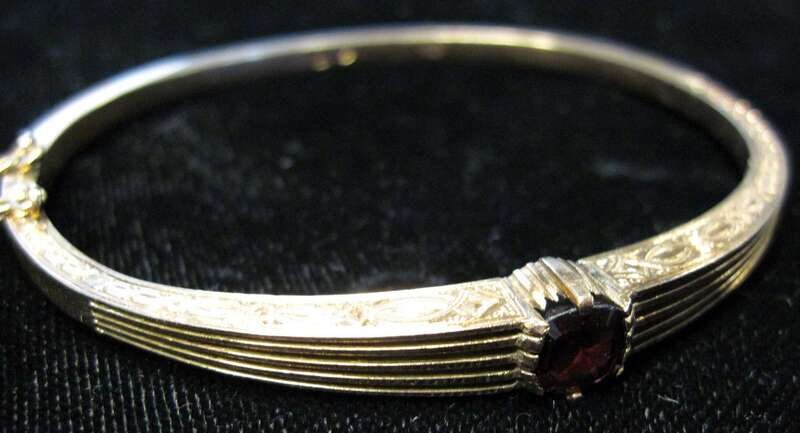 European hallmarked etched bangle bracelet, with prong set garnet center stone.