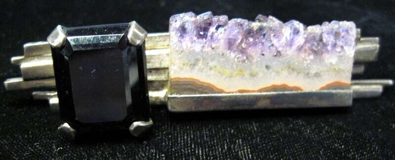 Large step cut amethyst prong set with elongated amethyst geode wedge, brooch can also be worn as a pendant.
