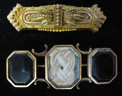 Both gold filled , one brooch with onyx plaques and blond braided hair lock, together with beaded design setting bar brooch.