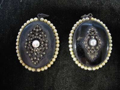 Black glass pendant with applied marcasite and mother of pearl accent, seed pearl frame, the back of each pendant contains one single lock of hair, one brown and one blond.
