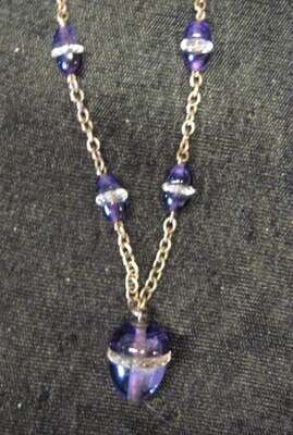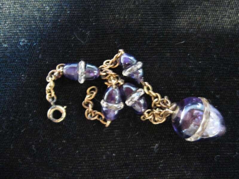 Unusual cabochon egg shaped amethyst beads separated by cut crystal centers, on a curb link chain, finishing with a large similarly shaped amethyst and crystal charm.