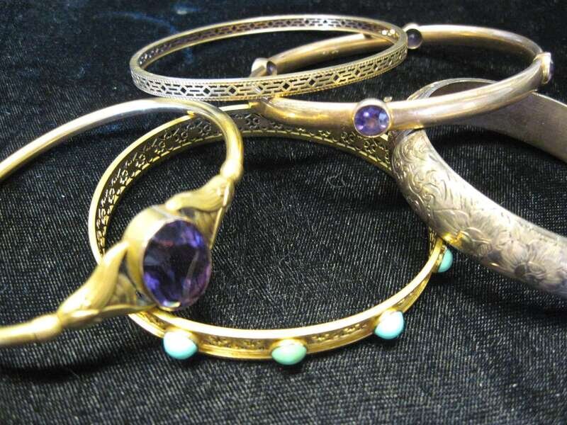 Two gold filled etched bracelets, with one turquoise set and two amethyst set. Of varying form and karat weight.