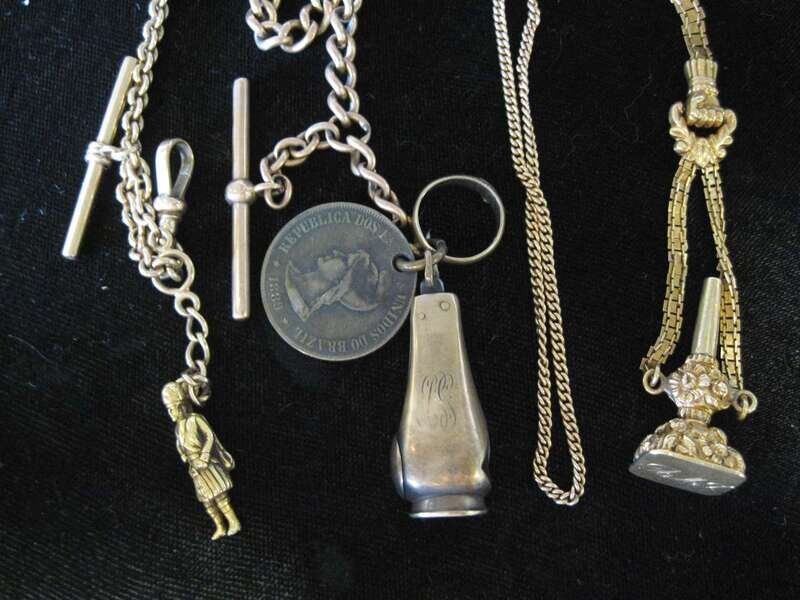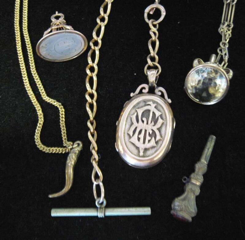 Consisting of seven chains, curb link, figaro, flexible trail link... accompanied by seven watch fobs of varying form.