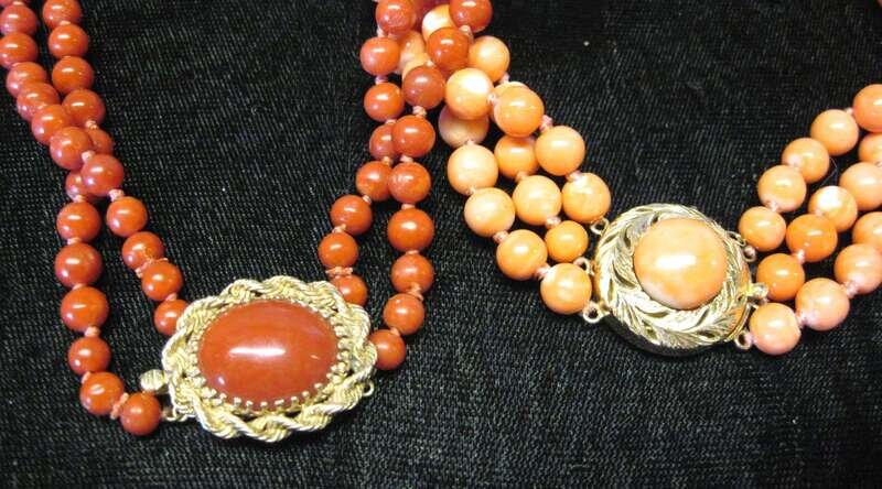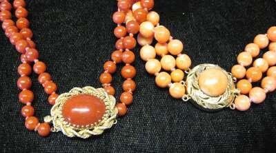 One in soft pink, the other in a darker red, both are graduated double strands.