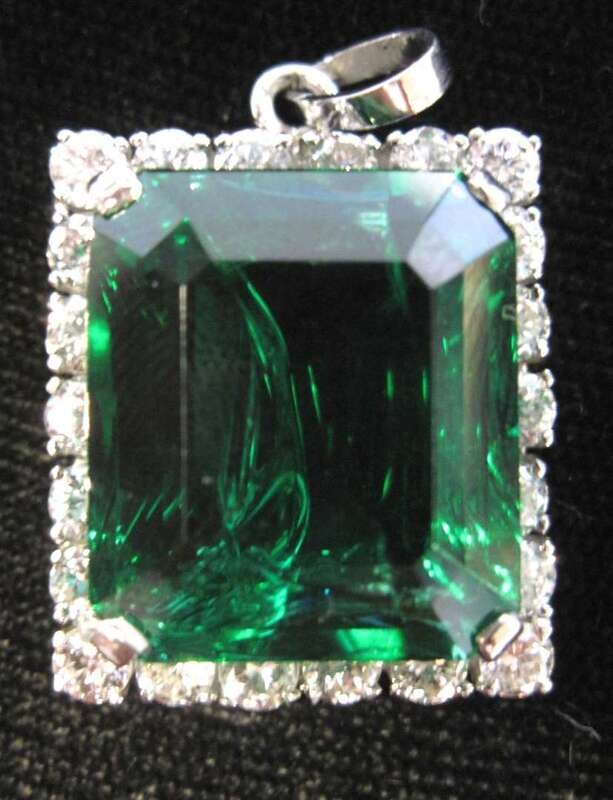 Step cut synthetic emerald framed by petite round cut diamonds.