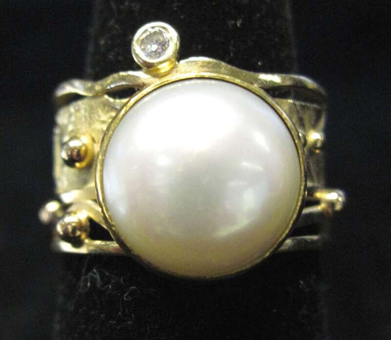 Oversized band ring, set with a single mabe pearl, and accented by a single petite round cut diamond, signed by the maker inside band.