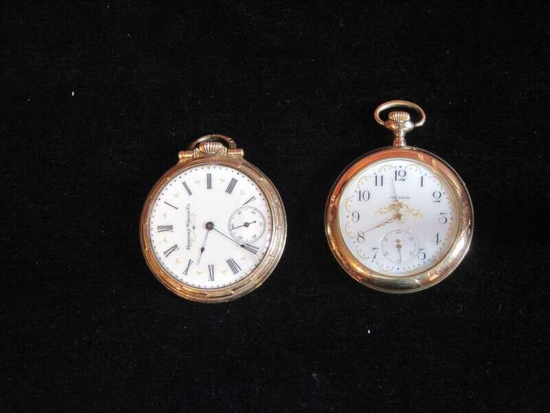 Waltham, decorative face and hands, black on white Arabic numeral dial with subsidiary seconds dial, No. 12913650 back of case engraved with a city and Hampden Watch Co., decorative face and hands, black on white Roman numeral dial with subsidiary seconds dial, No. 1214791.