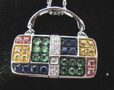 Whimsical 'purse' form pendant set with multi colored gem stones, accompanied by the original box, including a 17 1/2 in. thin white gold neck chain.