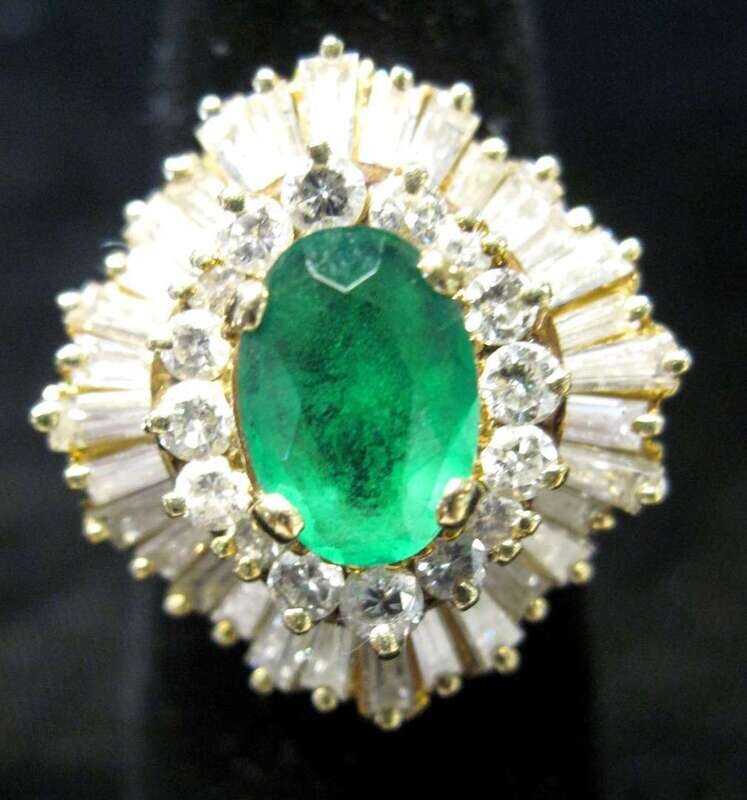 Oval cut emerald in round cut and baguette cut diamond ballerina setting.