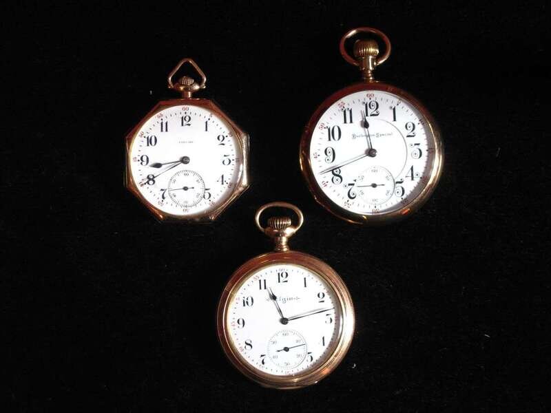 Precise, octagonal case, black on white Arabic numeral dial with subsidiary seconds dial, No. 2344029, Burlington Special, black on white Arabic numeral dial with subsidiary seconds dial, open back, No. 21889106, and Elgin, black on white Arabic numeral dial with subsidiary seconds dial, No. 10048881.
