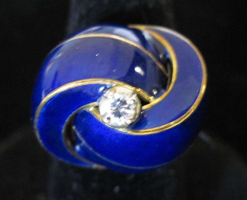 Cobalt blue enamel over yellow gold, in the tradition 'love knot' form accented by a petite circular cut diamond.